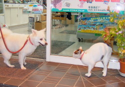 | ミルキーちゃんの彼氏 ムーン君も 一緒にお散歩していきます。 真っ白フワフワのワンちゃんが 二匹並んでお散歩してる姿は とってもかわいいですよ。 アメリカンエスキモーという 日本には珍しい犬種です。 アメリカ生まれです | ![]() ななこは女同士だから?か ミルキーちゃんと気が合うみたいです。 |